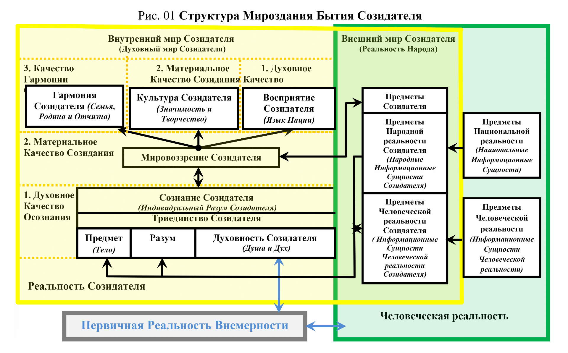 Человек, осознавая информационные сущности и созидая предметы Реальностей Рода, Народа и Нации, уменьшает Хаос и повышает степень Порядка Мироздания.