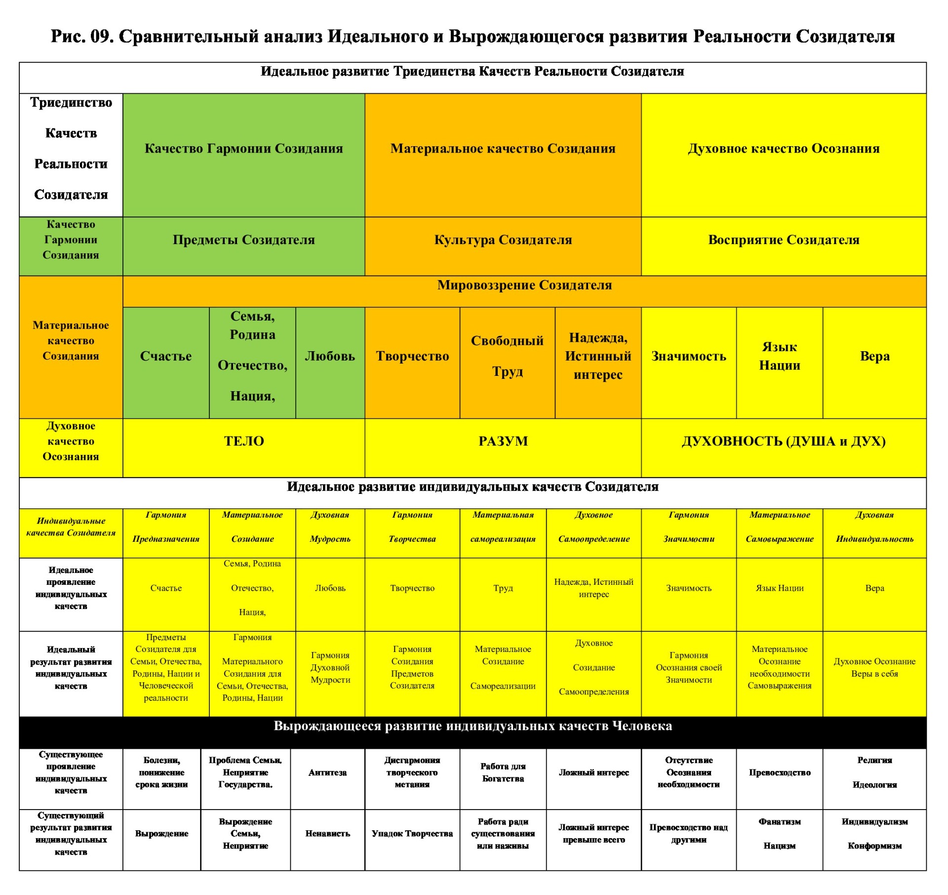 Венцом цивилизации потребления должна стать, так называемая, «элита», которая получает и распределяет те, созданные другими классами материальные блага. Культивирование ложных интересов Превосходства и Богатства формирует среду конформизма и индивидуализма развития человека по пути, умеющего животного, как идеального потребителя и производителя благ, дающего максимальную прибыль элите. Настоящее состояние развития индивидуальных качеств реальности человека (Рис.09) подводит к пределу количественного накопления отрицательного развития, после перехода которого, начнётся развитие качества по пути вырождения Реальности Созидателя и Человеческой реальности, а это означает исчезновение человека, как вида.